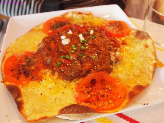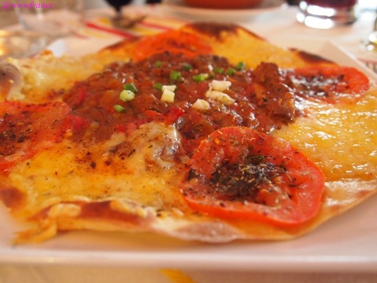 あっつあつでうっすーーーいピザ生地みたいなのにチーズと子牛肉がどっぷりのっていて、、