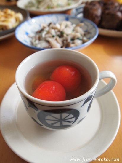 異様に素晴らしく味わい深いスープ、湯むきされたプチトメイトウ、、